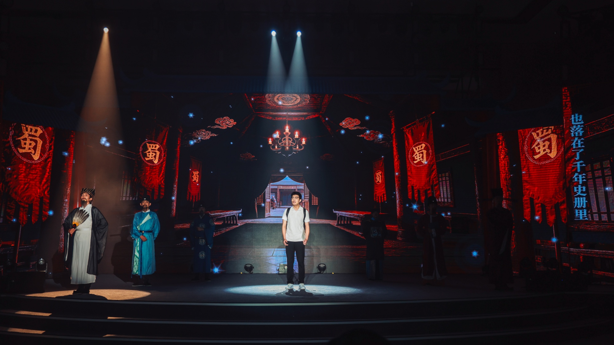 舞台剧尾声,六位先贤并排而立,汪国伟举起手中的《名录》,面向不雅众,高喊:“蜀法之光,川流束缚。”