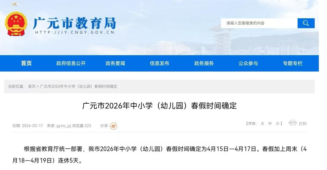 2026年2月下旬,广元市里面分自媒体及集合平台对广元市春秋假安排进行了转发接头。研讨信息援用了2025年11月11日“广元老练在线”微信公众号发布的春秋假轨制计谋解读践诺。“我局获悉后,于2月27日陈述事区老练主宰部门及直属学校,强调春假时辰及安排须以进展文献陈述为准,并条款实时向学生评释情况。”