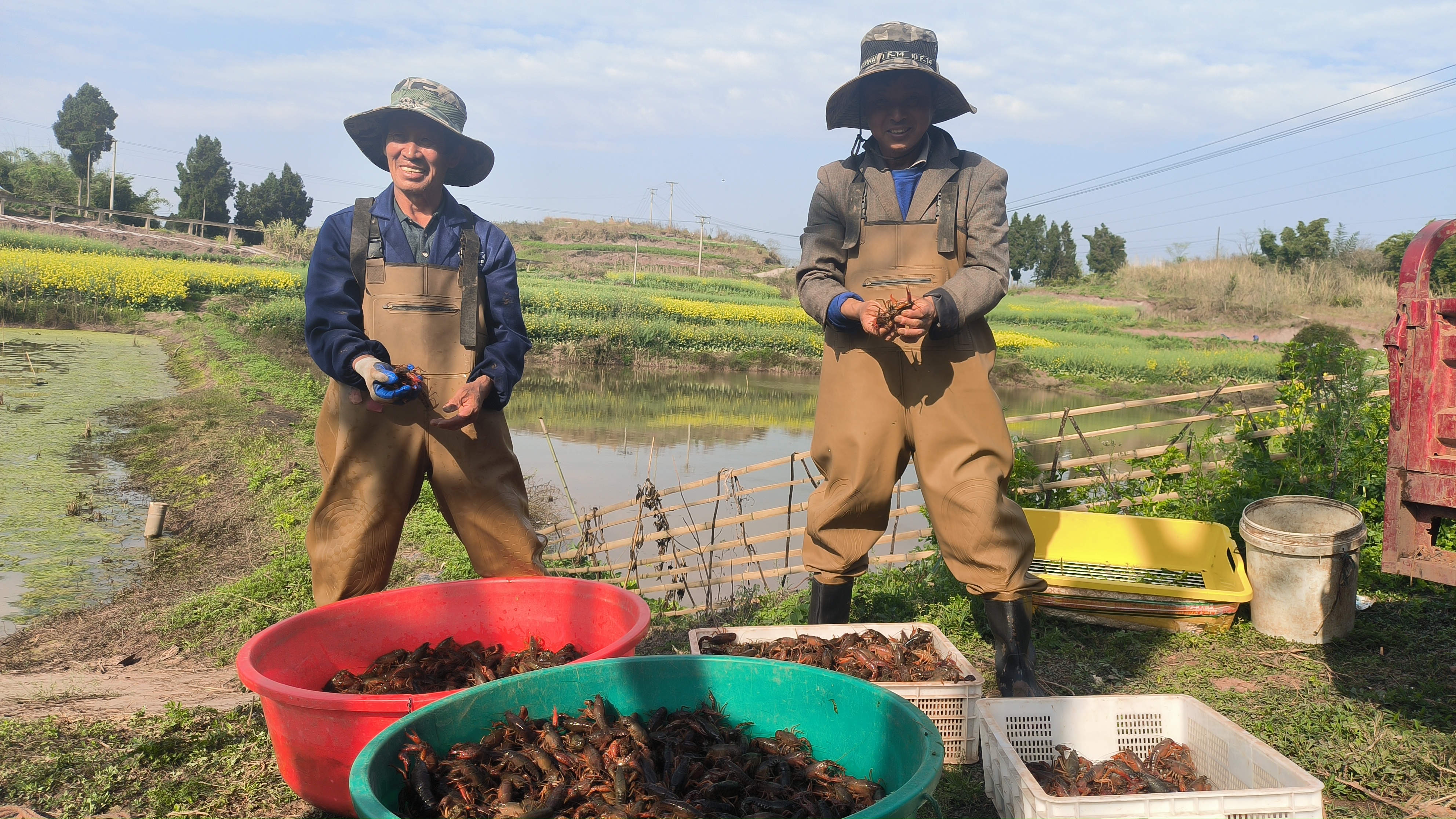 3月中上旬,自贡荣县东佳镇赵家桥村的稻虾田边一片竭力征象。跟着一声“起笼”令下,虾农们熟识地拿起水中地笼,一刹间,一只只“青壳白肚”的小龙虾手舞足蹈地落入虾筐,水花四溅。