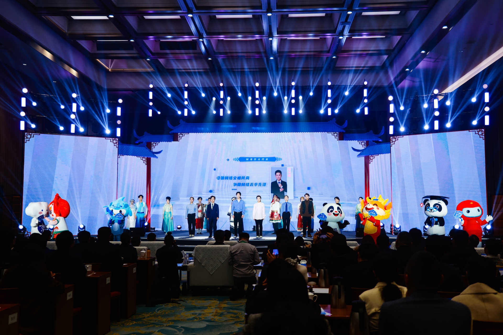 开场秀尾声,整体演员、嘉宾与IP玩偶共同唱响《好风起》,激光再度能干,雕饰出“E法同业”品牌LOGO,大屏幕中打出“E法同业 清未来府”。