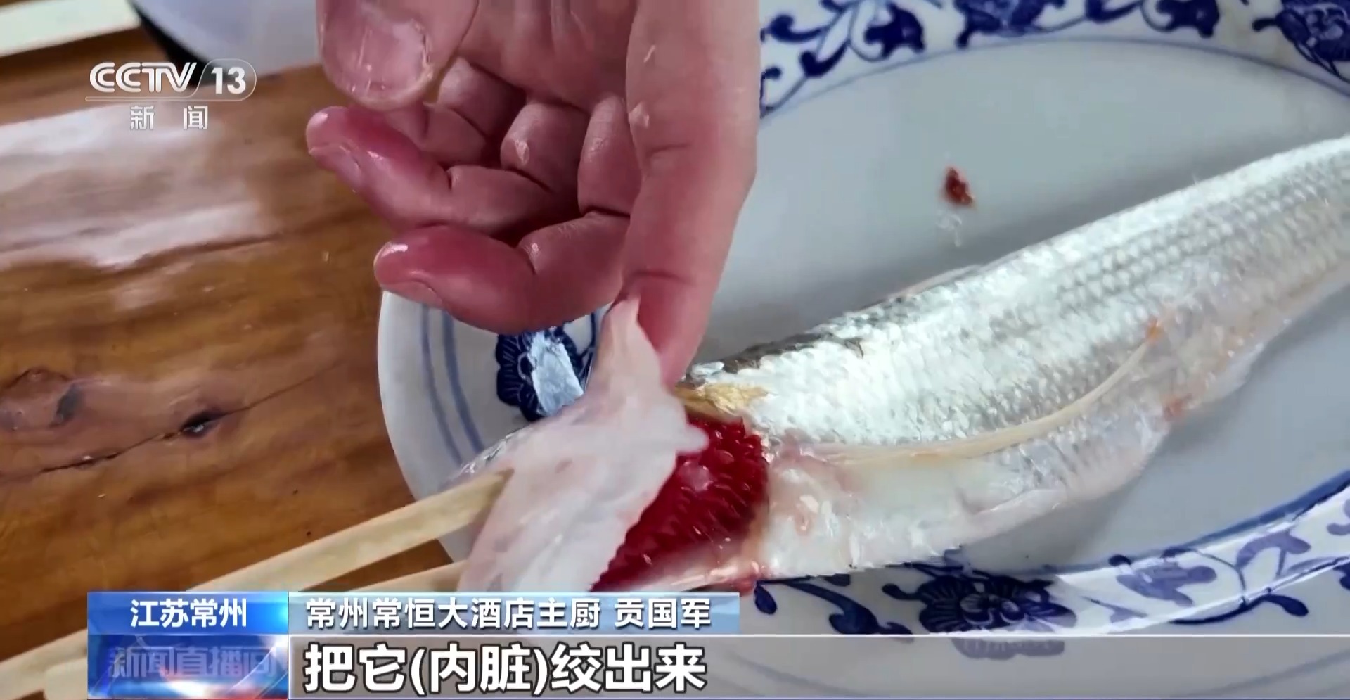 常州常恒大旅社主厨 贡国军:我会用筷子通过鳃把它翻开之后,把内脏绞出来,这么出来的刀鱼相比圆善。