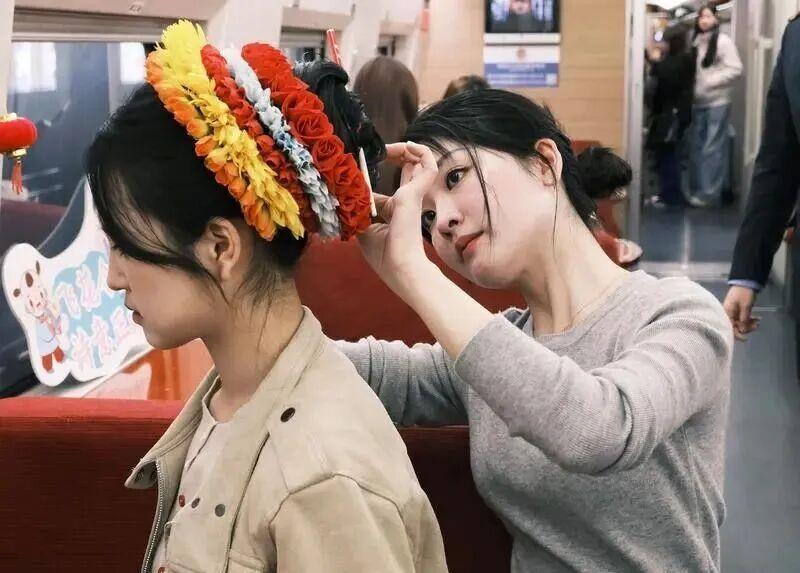 专列的9号车厢被相称移交为赏花主题空间,以鲜切花束与花艺遮挡当作点缀,营造出花香萦绕的搭车环境。列车管事的一大亮点是推出了源自闽南的簪花非遗体验状貌,乘务东说念主员会为游客佩带细致的簪花头饰,让这一独具特色的闽南习惯文化在路径中得以传播与互动。
