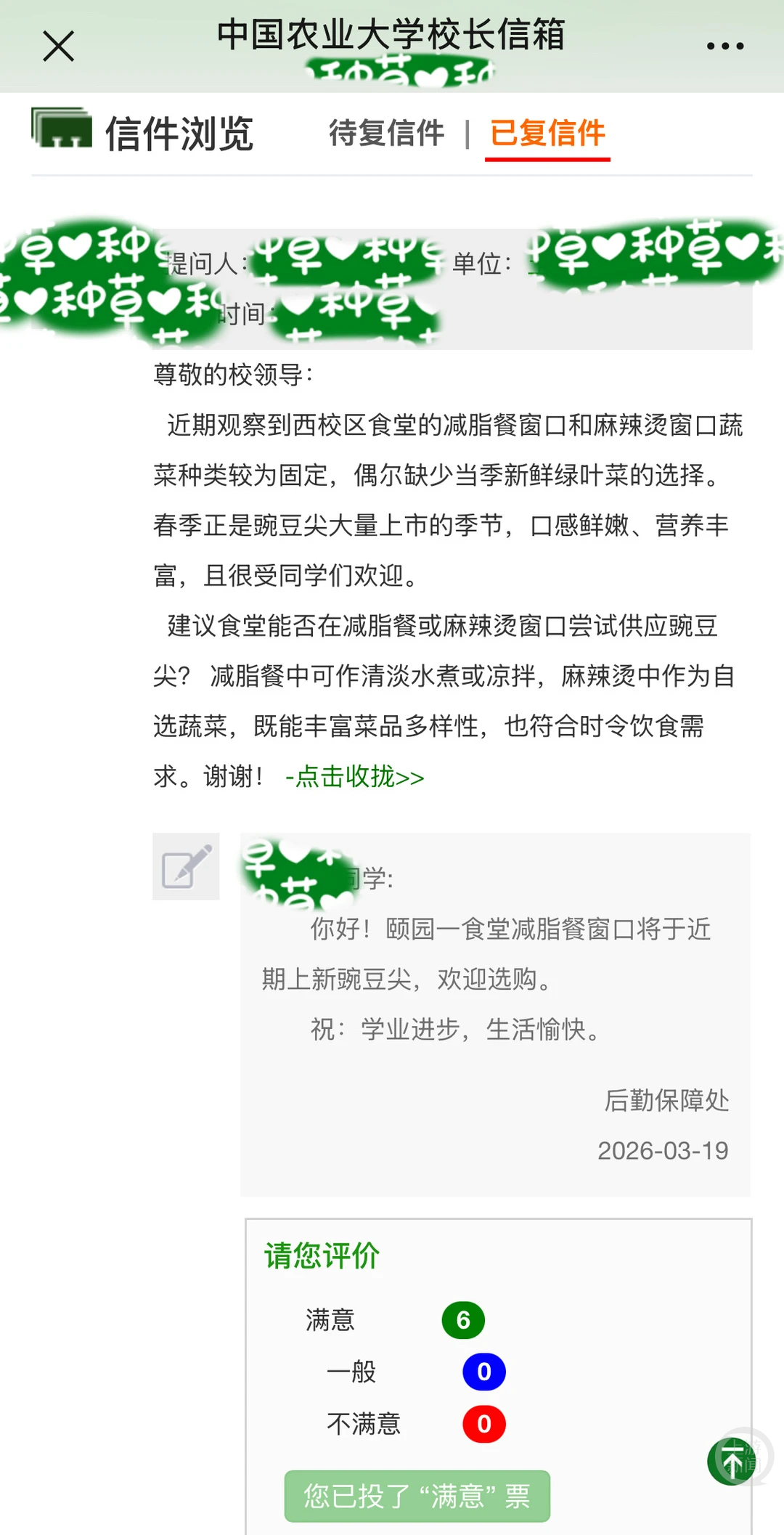 发帖晒出的邮件截图显现,有学生在校长信箱中写谈:“近期不雅察到西校区食堂的减脂餐窗口和麻辣烫窗口蔬菜种类较为固定,偶尔败落当季极新绿叶菜的遴荐。春季恰是豌豆尖宽敞上市的季节,口感鲜活、养分丰富,且很受同学们接待。”该学生提议:“食堂能否在减脂餐或麻辣烫窗口尝试供应豌豆尖?减脂餐中可清淡水煮或凉拌,麻辣烫中也可算作自选蔬菜,既能丰富菜品万般性,也得其时令饮食需求。”3月19日,后勤保险处覆信称,颐园一食堂减脂餐窗口将于近期上新豌豆尖,接待选购。