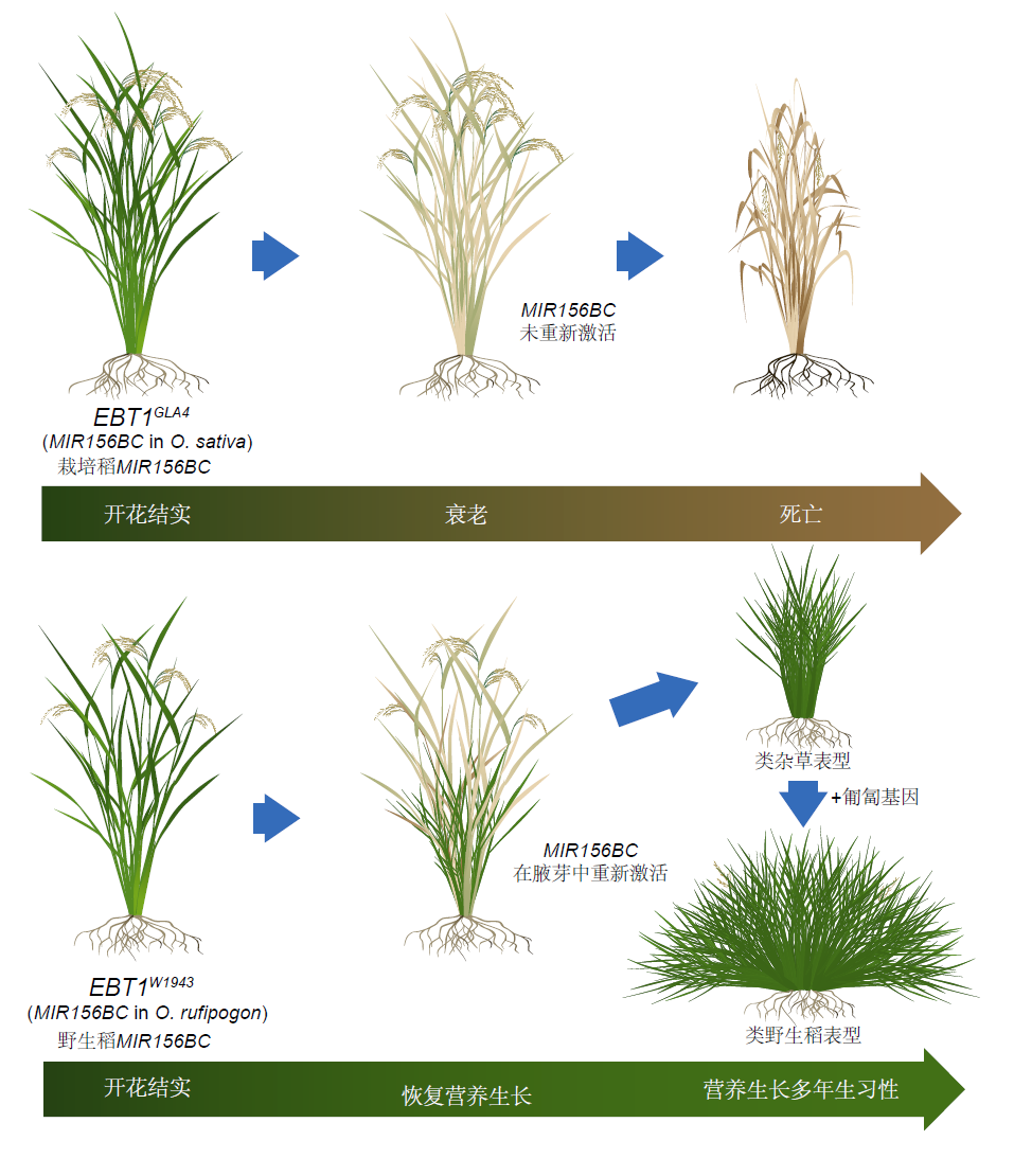 这项有计划来自中国科学院分子植物科学非凡革命中心,植物性状酿成与塑造世界重心现实室韩斌院士团队和植物高效碳汇重心现实室(中国科学院)王佳伟有计划员团队初度克隆了决定野生稻多年生生计习性的要道基因EBT1,并发达了该基因座位抒发模式的转换是水稻在驯化进程中由多年生向一年生转念的要道。