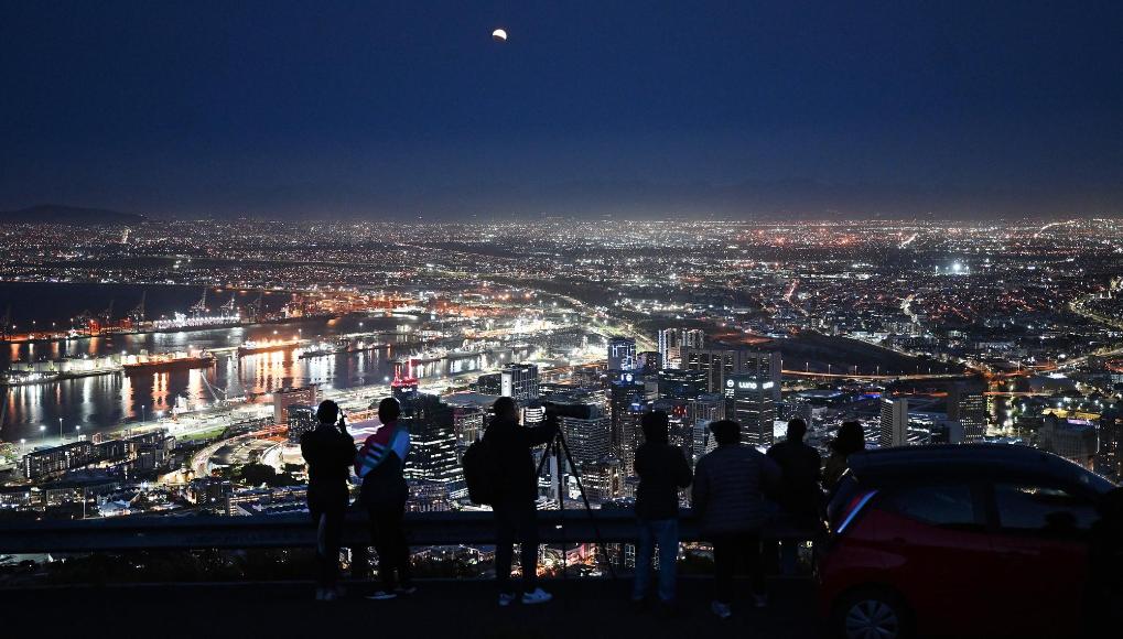 2025年9月7日,在南非开普敦,东谈主们不雅看城市夜空中的月食。新华社发(哈比索·姆卡贝拉 摄)