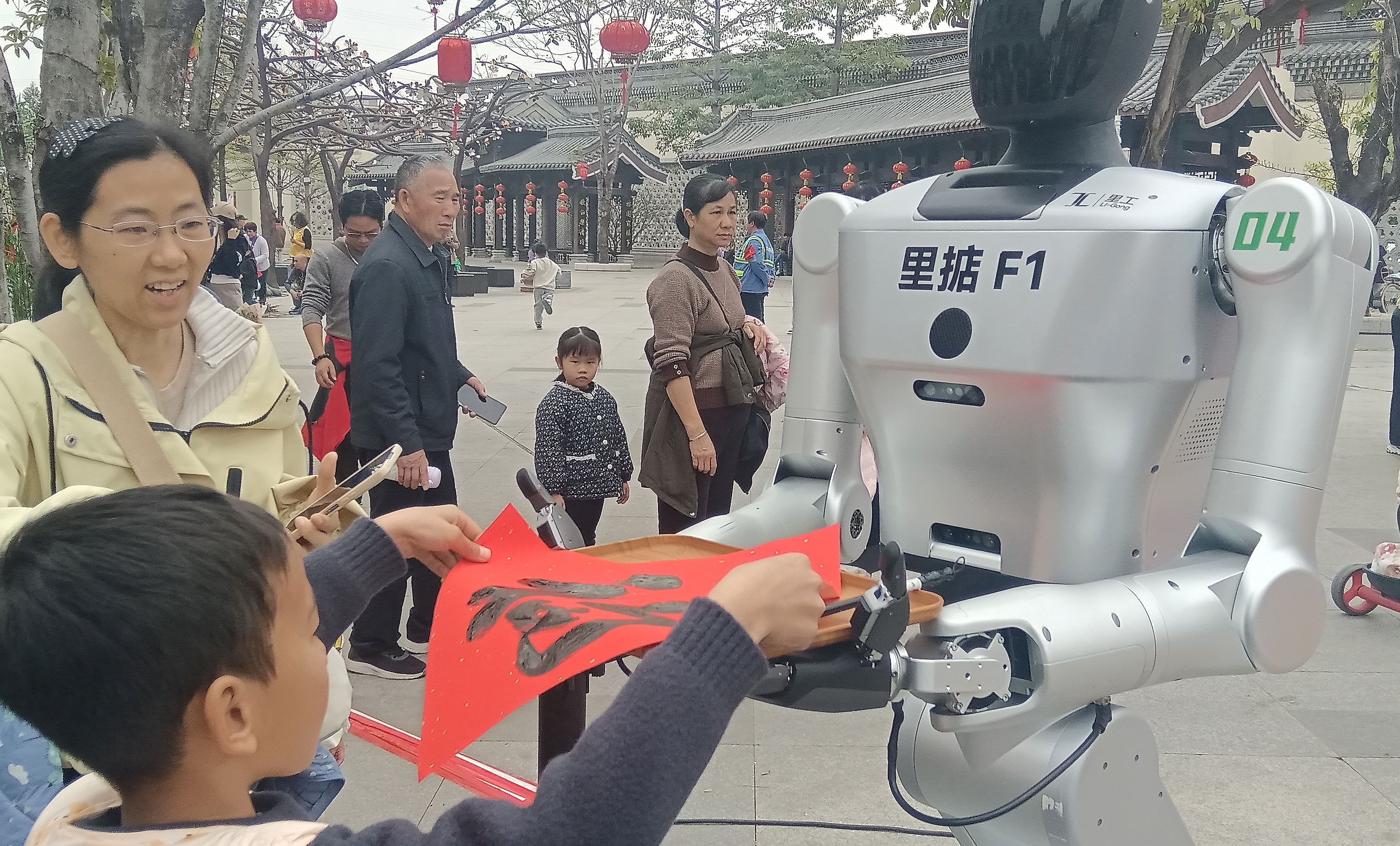 本届桃花雅会更突显湾区特质,广邀粤港澳三地艺术名家、后生学子与当地各民族群众近60东说念主都聚一堂,执翰墨、绘桃韵,随心共创《湾区春桃图》,以笔为桥、以画为语,开展一场超越地域、连通代际的艺术对话,将湾区文化共生共融的祥和与渴望,凝于尺素之间。和往年不同的是,本年现场特设里工机器东说念主互动专区,当字画家挥毫泼墨之时,机器东说念主剖析相伴、辅笔添彩,为游东说念主奉上氤氲着墨香的“桃花福字”与新对子语,并与群众互动及拍照迷恋。此外,AI桃花旅拍区依托智能影像时刻,一键定格古风倩影,让每一位游东说念主都能千里浸式入画,邂逅不不异的春日时髦。百年街区化身大型国风戏院,“桃墟新韵”市场集聚非遗手作、文创雅物、岭南珍味,全息3D投影织就梦幻桃林,NPC身着古风华服穿梭其间。