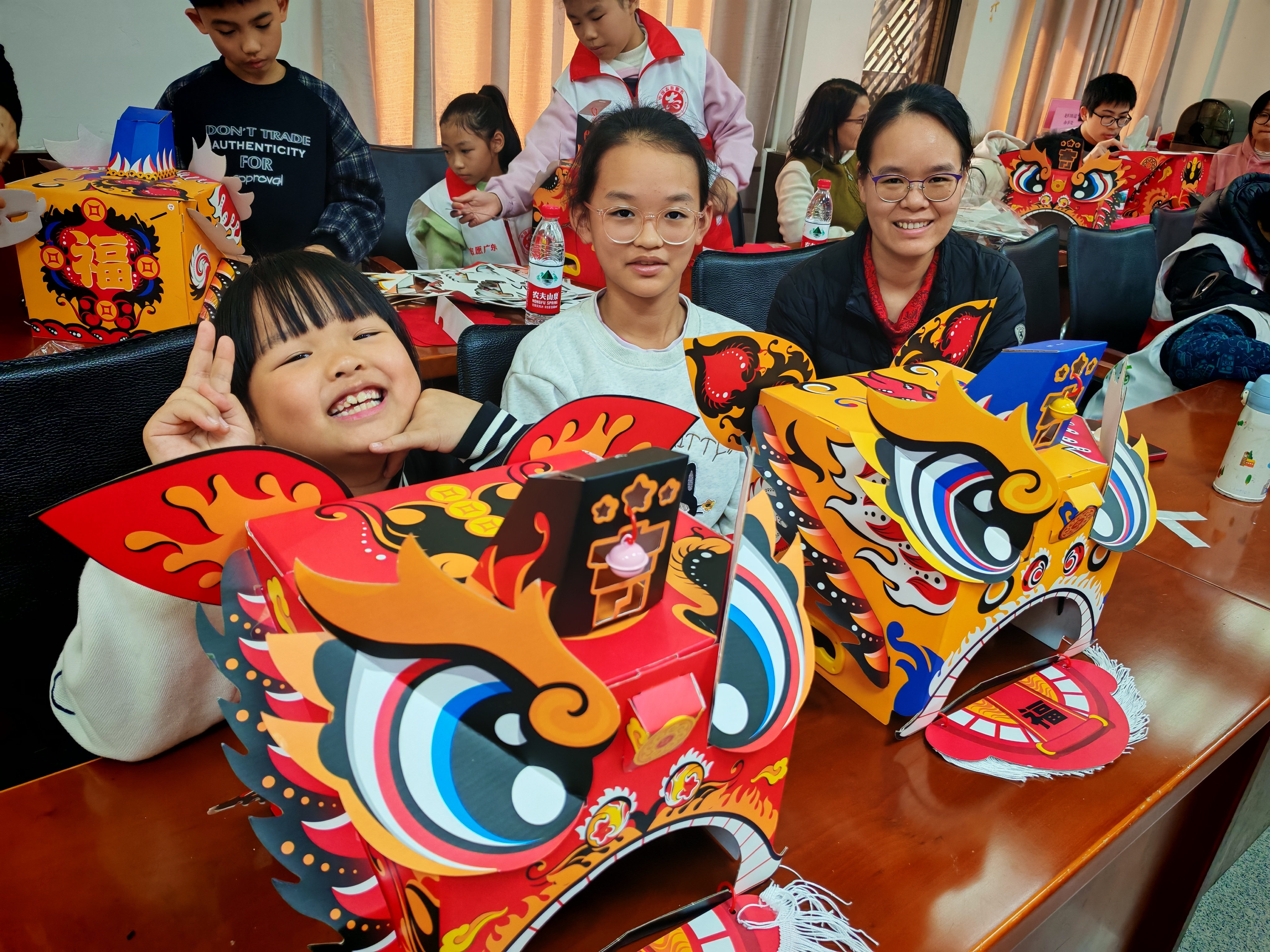 行为滥觞,十余组亲子家庭在龙归街社工们的指挥下,共同干涉醒狮狮头DIY制作,描彩、粘贴、拼装……一个个狮头在亲子合作下逐步变得灵动好意思艳、色调飞腾,孩子们千里浸式体验岭南非遗传统文化的私有魔力。随后,头戴狮头的孩子们化身“小小道喜使臣”,与志愿者们沿途为窘境长辈奉上寓意“大吉大利”的年桔盆栽和节日慰问品,稚嫩的扮演、诚恳的致意带来阵阵怡悦声。收到年桔的周伯暗示,我方每年王人能收到党和政府的节日温存,本年孩子们来送平和,更是惊喜怡悦,提前感受到浓浓的年味!
