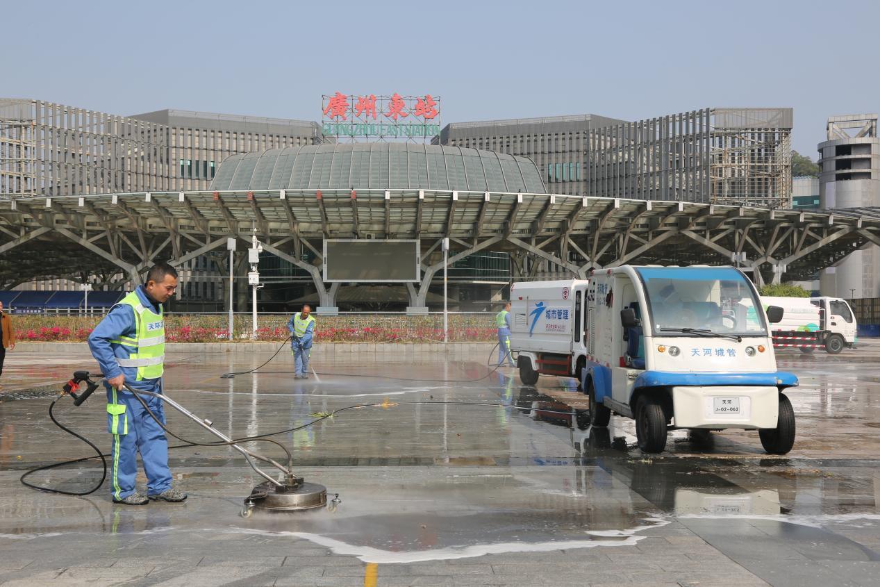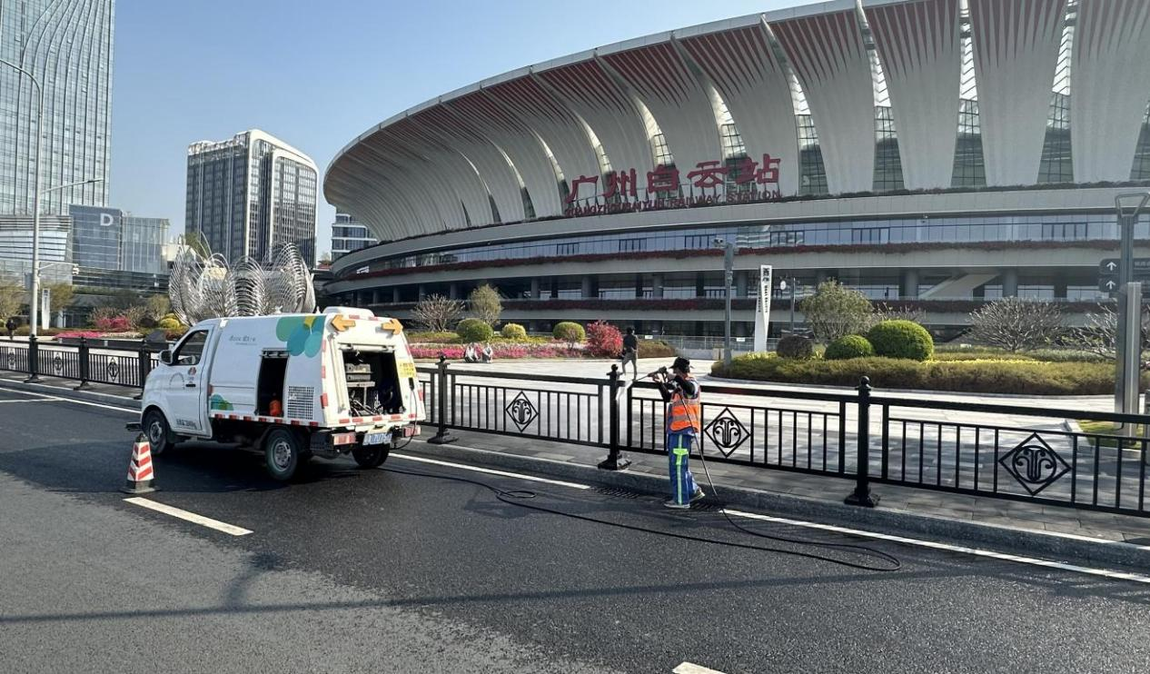 河汉区第二保洁所针对广州东站、河汉汽车客运站左近区域,严格落实定东说念主、定岗、定时的24小时轮流无休保洁,并调配36台高压冲洗车辆对车站平台及游客通说念进行深度刷洗。