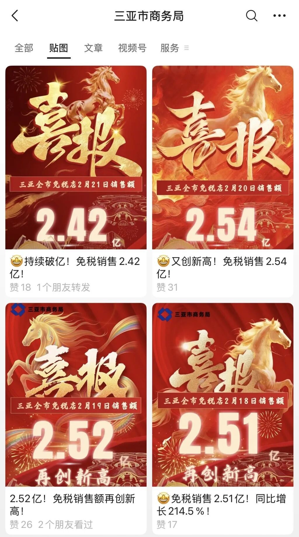 澎湃新闻发现,自马年春节大年月朔(2月17日)以来,三亚市的免税销售总数长入5天冲破2亿元。2月17日,三亚市四家离岛免税店销售总数2.04亿元,创“年月朔”新高。2月18日,三亚市四家离岛免税店销售总数达2.51亿元,同比增长214.5%(农历同比增长36.7%),其中cdf三亚海外免税城销售额单日破2亿。2月19日,三亚市四家离岛免税店销售总数2.52亿元,同比增长262.6%(农历同比增长27.6%)。2月20日,三亚市四家离岛免税店销售总数2.54亿元,同比增长281.7%(农历同比增长28.7%)。